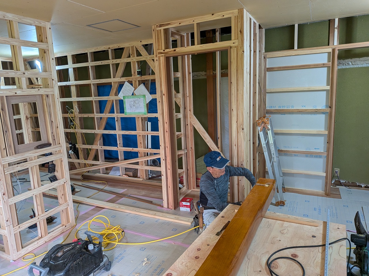 既存柱の加工と調整を行いました。 お施主様から「家の象徴でもある床柱をどこかに使いたい」とのご希望をいただき、 長年この家を支えてきた床柱を、新しい構造の中で再び活かす作業です。 年月を重ねた木には、…