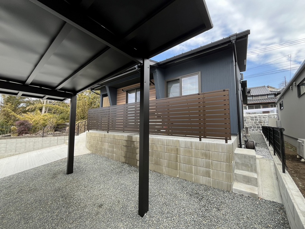 今回の工事では、カーポートの設置をはじめ、敷地境界部分の塀・フェンス、花壇、駐車スペース、そして建物へのアプローチ部分まで、外構全体をトータルで施工させていただきました。