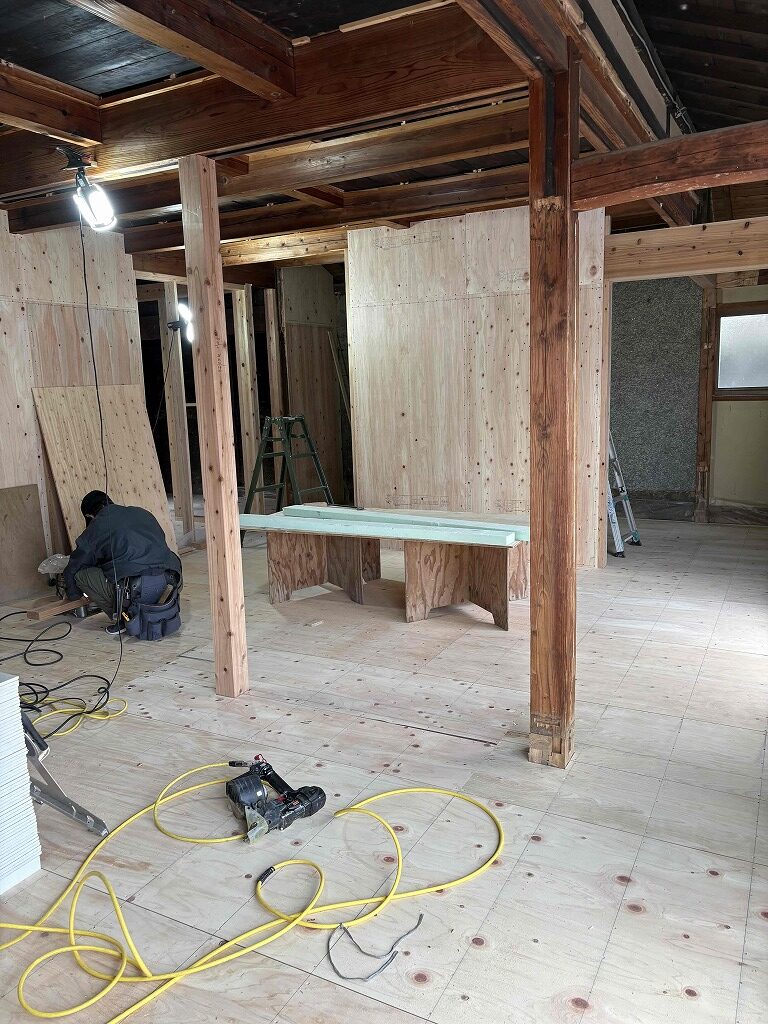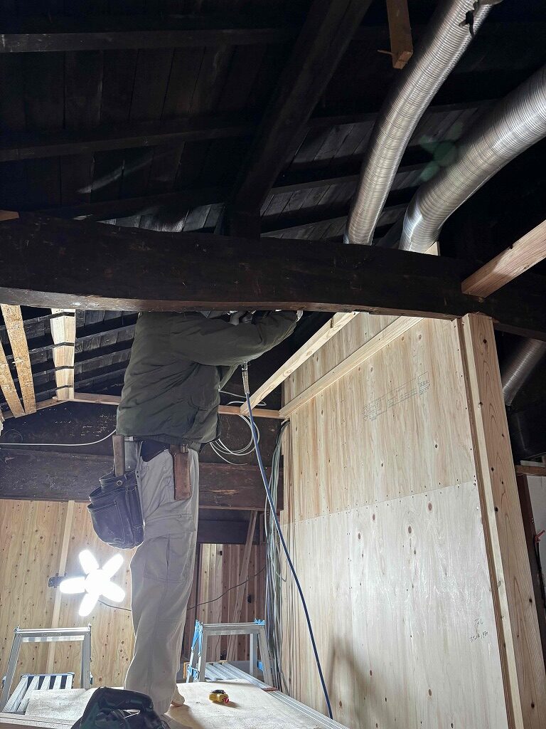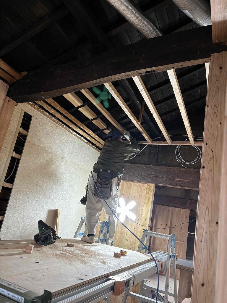 天井は新たに下地を組み直し、断熱性や設備配管とのバランスを考慮しながら施工を進めています。見た目だけでなく、快適性やメンテナンス性も向上させることが今回のポイントです。 リノベーションは「すべてを新しくする」ことではなく、「活かせるものを活かす」こと。